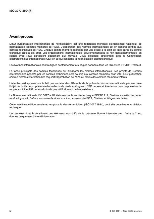 ISO 3077:2001 is a standard published by the International Organization for Standardization (ISO). Its full title is "Short-link chain for lifting purposes - Grade T, (types T, DAT and DT), fine-tolerance hoist chain". This standard covers: This International Standard specifies requirements for fine-tolerance hoist chain of Grade T (types T, DAT and DT) for use with manually operated or power-driven chain hoists1). It is applicable to electrically welded, round, steel short-link chain, heat-treated and tested in accordance with the general conditions of acceptance of ISO 1834, in the nominal chain size range from 3 mm to 22 mm. NOTE Type T chain, but not type DAT or DT, may be used in lifting equipment other than chain hoists. Chain of grades TH and VH, intended specifically for use in hand-operated hoists, will be the subject of future International Standards.