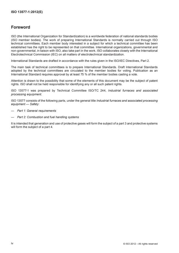 ISO 13577-1:2012 is a standard published by the International Organization for Standardization (ISO). Its full title is "Industrial furnaces and associated processing equipment — Safety — Part 1: General requirements". This standard covers: ISO 13577-1:2012 specifies the general safety requirements common to industrial furnaces and associated processing equipment (TPE). It details significant hazards associated with TPE, and specifies the appropriate preventive measures for reduction or elimination of these hazards. ISO 13577-1:2012 gives general principles and general safety requirements for the reduction of risks associated with TPE. It is not applicable to the risks associated with quenching, vacuums, salt baths, liquid phase treatment and protective or reactive atmospheres. ISO 13577-1:2012 specifies the safety requirements at stages in the life of the equipment, and its design, ordering, construction, use and disposal. It specifies safety requirements for maintenance, provision for indicators and inspection. It deals with the significant hazards, hazardous situations or hazardous events relevant to the equipment, when it is used as intended and under conditions of misuse which are reasonably foreseeable by the manufacturer: