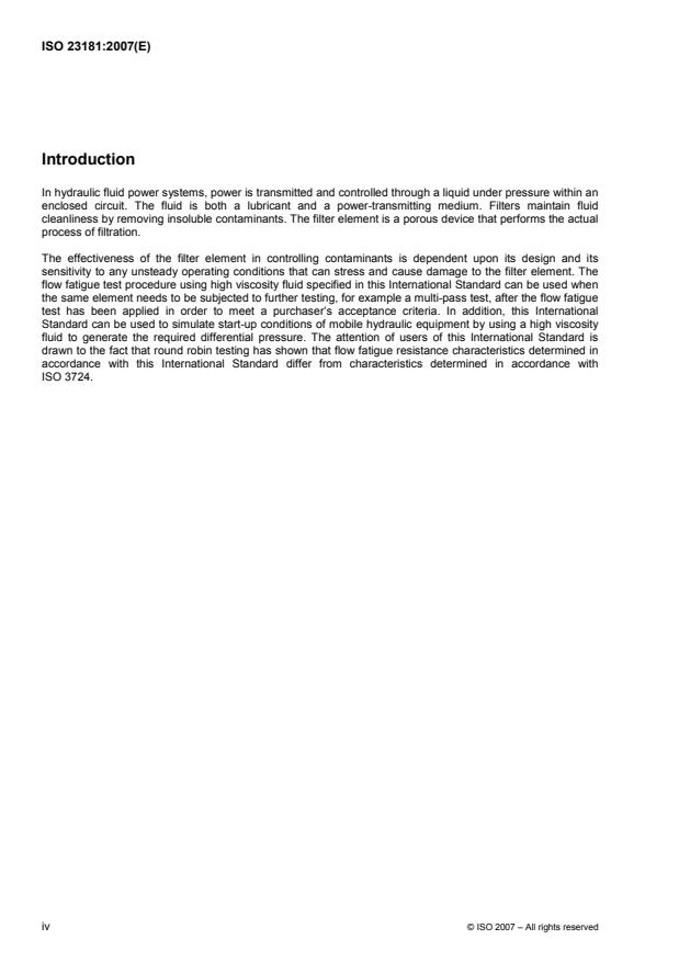 ISO 23181:2007 specifies a method for determining the resistance of a hydraulic filter element to flow fatigue when subjected to high viscosity fluid, using a uniformly varying flow rate up to a predetermined terminal differential pressure and a controlled waveform. It establishes a method for verifying the ability of a filter element to withstand the flexing caused by cyclic differential pressures induced by a variable flow rate.