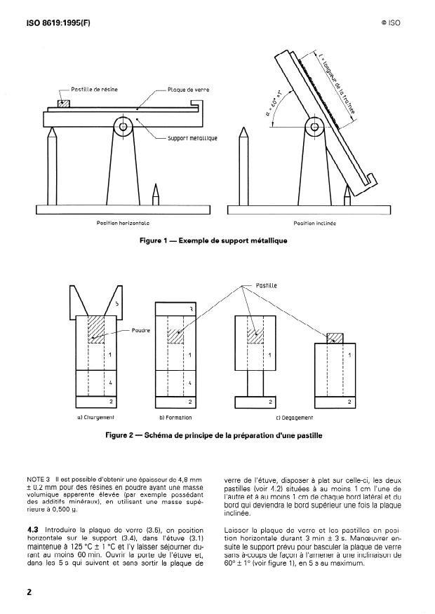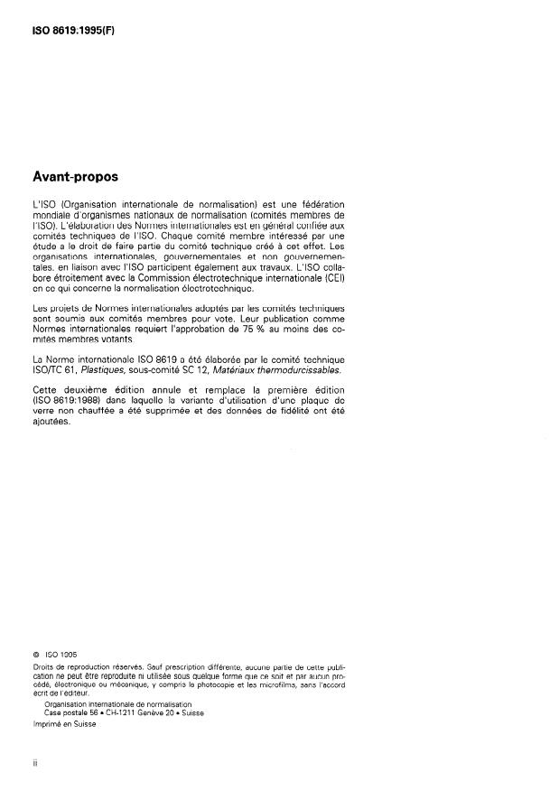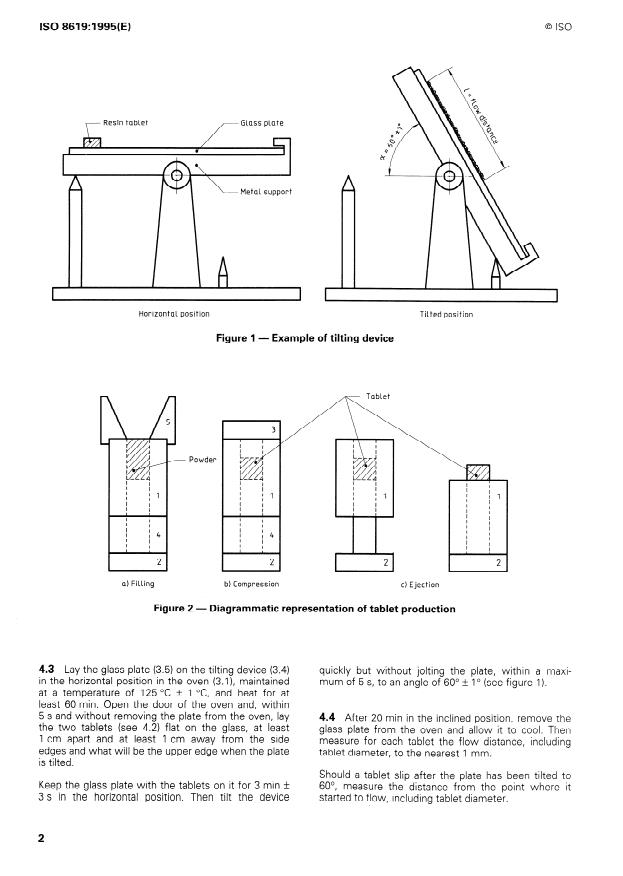 ISO 8619:1995 is a standard published by the International Organization for Standardization (ISO). Its full title is "Plastics — Phenolic resin powder — Determination of flow distance on a heated glass plate". This standard covers: Specifies a method for the determination of the flow distance of powdered heat-setting phenolic resins for production and control. With reference to tablet formation, test temperature and angle of inclination of the glass plate, measurement of the flow distance involves arbitrarily defined conditions.