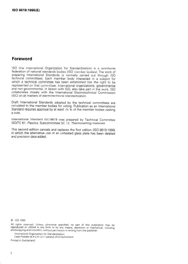 ISO 8619:1995 - Plastics -- Phenolic resin powder -- Determination of flow distance on a heated glass plate