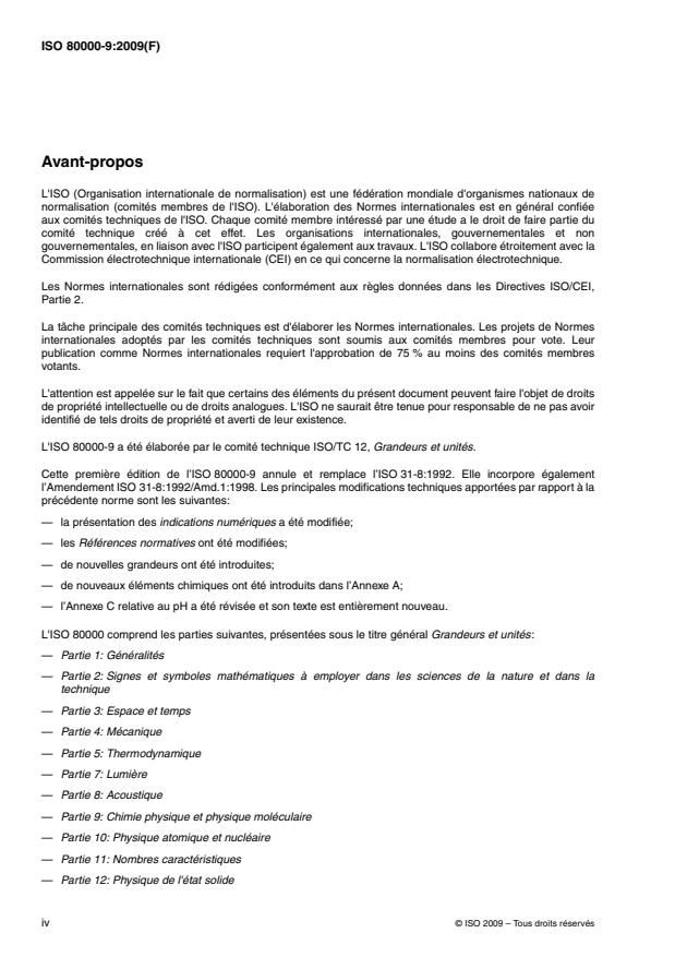 ISO 80000-9:2009 is a standard published by the International Organization for Standardization (ISO). Its full title is "Quantities and units — Part 9: Physical chemistry and molecular physics". This standard covers: ISO 80000-9:2009 gives names, symbols, and definitions for quantities and units of physical chemistry and molecular physics. Where appropriate, conversion factors are also given.