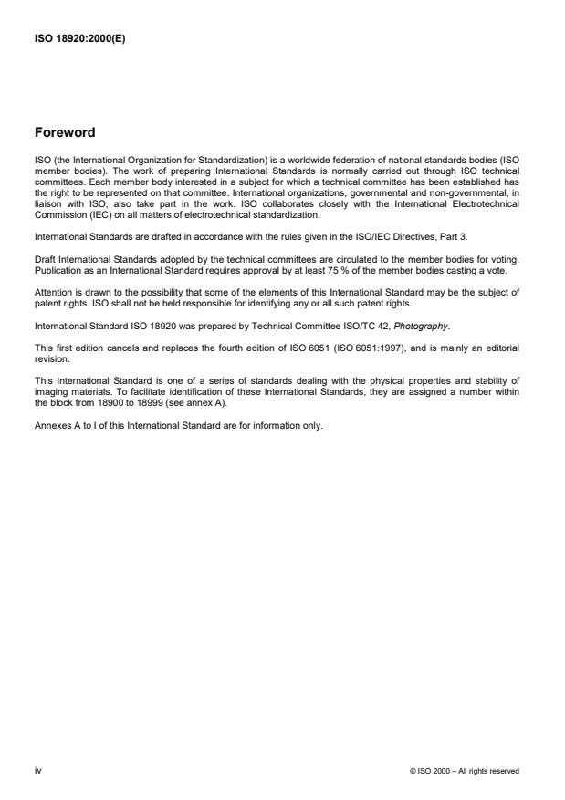 ISO 18920:2000 is a standard published by the International Organization for Standardization (ISO). Its full title is "Imaging materials — Processed photographic reflection prints — Storage practices". This standard covers: Specifies dark storage conditions, storage facilities, and procedures for the handling and inspection of reflection prints of all types and sizes.