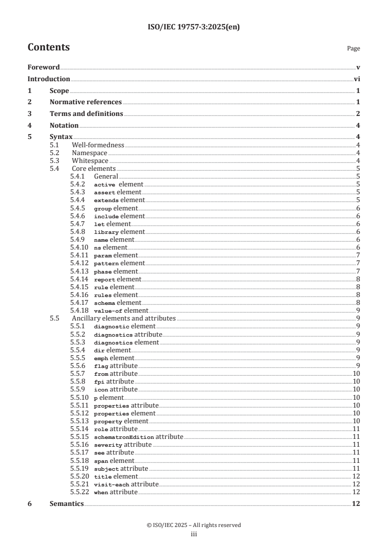 ISO/IEC 19757-3:2025 is a standard published by the International Organization for Standardization (ISO). Its full title is "Information technology - Document Schema Definition Languages (DSDL) - Part 3: Rule-based validation using Schematron". This standard covers: This document specifies Schematron, a schema language for XML. This document establishes requirements for Schematron schemas and specifies when an XML document matches the patterns specified by a Schematron schema. Schematron uses query languages such as XPath for writing assertions.