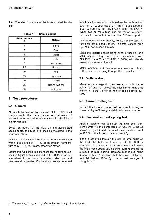 ISO 8820-1:1994 is a standard published by the International Organization for Standardization (ISO). Its full title is "Road vehicles — Blade-type electric fuse-links — Part 1: Rated current, identification, test procedures and performance requirements". This standard covers: Establishes the rated current, identification, test procedures and performance requirements for blade-type electric fuse-links with rated currents up to and including 30 A, used to protect on-board wiring harnesses and electrical equipment, with a rated voltage up to and including 32 V, of road vehicles and similar applications from overcurrent. Interruption of the circuit is achieved as a result of the fuse element melting. Dimensions for blade-type electric fuse-links are specified in ISO 8820-2, and the test fixture in ISO 8820-3.