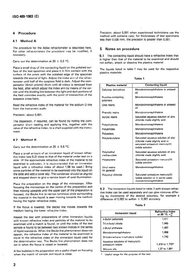 ISO 489:1983 is a standard published by the International Organization for Standardization (ISO). Its full title is "Plastics — Determination of the refractive index of transparent plastics". This standard covers: Plastics — Determination of the refractive index of transparent plastics