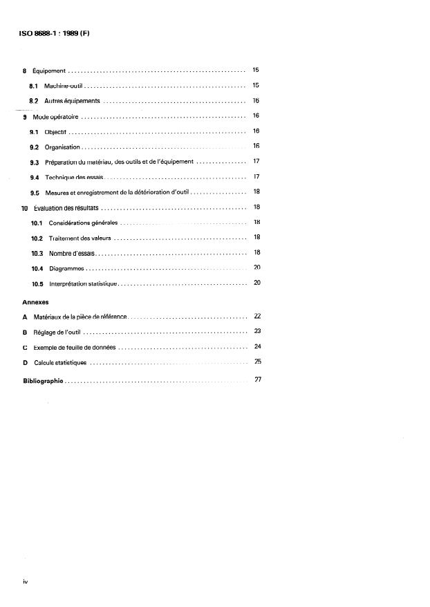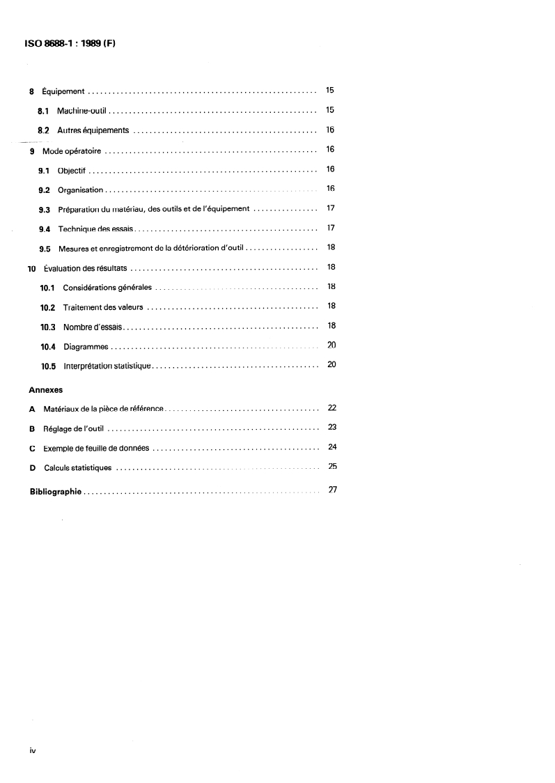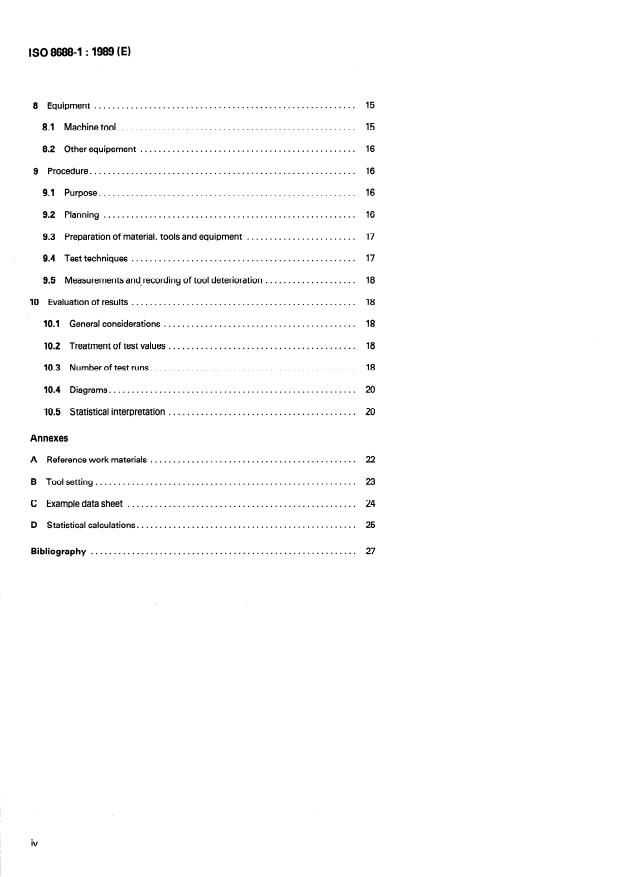 - Defines required equipment, test planning, measurements of tool deterioration, data recording, statistical treatment and presentation of results (including annexes for reference materials, toolsetting, datasheets and statistical calculations).