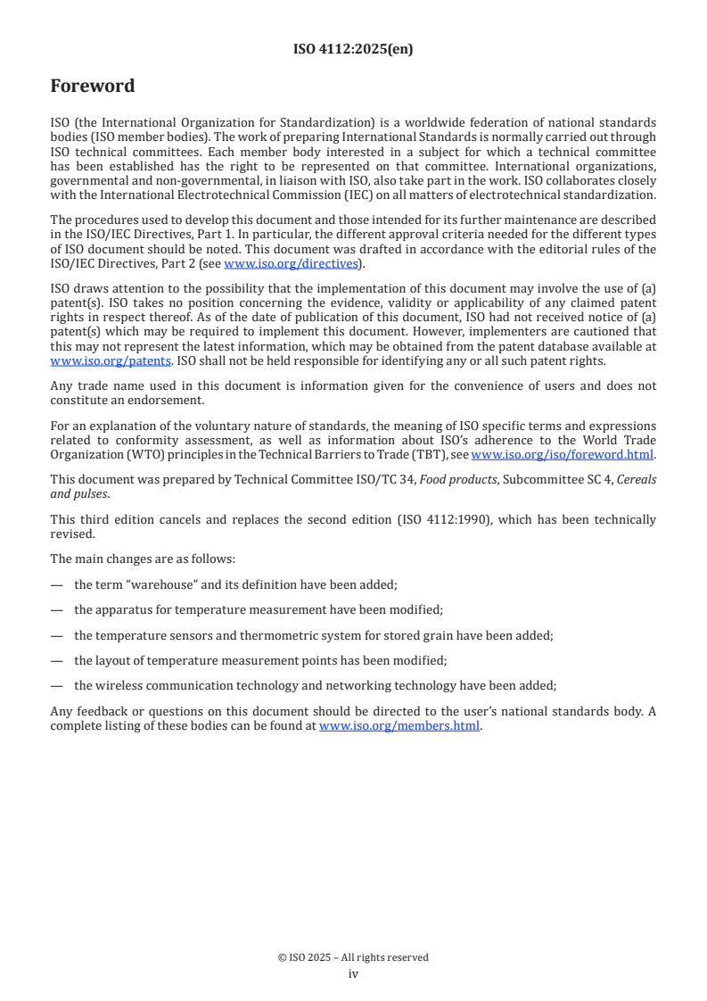 ISO 4112:2025 provides guidance for the measurement of the temperature of grain stored in bulk (cereals and pulses) in silos, horizontal warehouses and other storage buildings. The standard describes the principle of placing thermometric probes throughout a grain mass, the required apparatus and sensor types, probe layouts, measurement procedures, digital display/recording, and basic calibration and record-keeping expectations. The 2025 edition updates probe layouts, thermometric systems and adds guidance on wireless/networked monitoring.