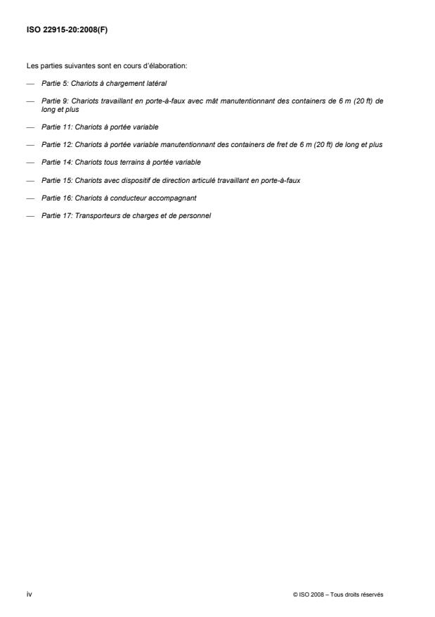 L'ISO 22915 comprend les parties suivantes, présentées sous le titre général Chariots de manutention —