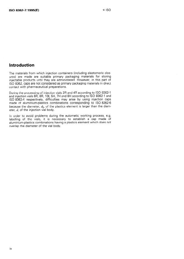 ISO 8362-7:1995 is a standard published by the International Organization for Standardization (ISO). Its full title is "Injection containers for injectables and accessories — Part 7: Injection caps made of aluminium-plastics combinations without overlapping plastics part". This standard covers: Relates to aluminium-plastics combinations for the injection caps of injection vials where the plastics part does not overlap the diameter of the vial body.