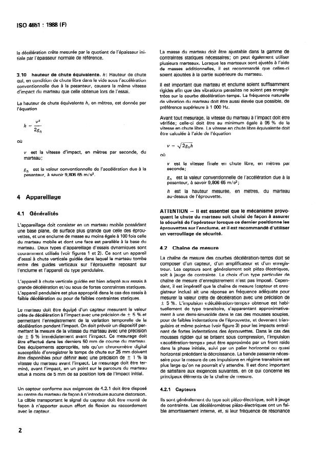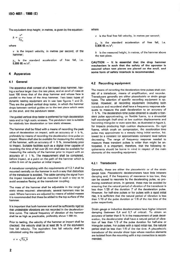ISO 4651:1988 is a standard published by the International Organization for Standardization (ISO). Its full title is "Cellular rubbers and plastics - Determination of dynamic cushioning performance". This standard covers: Defines a method measuring the peak deceleration of a mass when it is dropped on a test piece. The test described is intended primarily for quality assurance; however, an annex contains notes to be considered if the test is used to obtain design data. Two figures show typical arrangements.