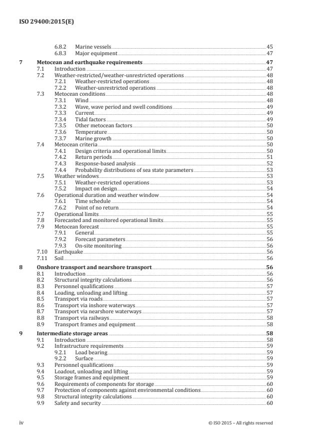 ISO 29400:2015 is a standard published by the International Organization for Standardization (ISO). Its full title is "Ships and marine technology — Offshore wind energy — Port and marine operations". This standard covers: ISO 29400:2015 provides comprehensive requirements and guidance for the planning and engineering of port and marine operations, encompassing all documents and works related to such port and marine operations, e.g. the design and analysis of the components, systems, equipment and procedures required to perform port and marine operations, as well as the methods or procedures developed to carry them out safely. ISO 29400:2015 is intended to be comprehensive, covering all relevant information related to port and marine operations necessary for the installation and maintenance of offshore wind farms. It is not applicable to the case of floating turbines moored to the seabed. This International Standard is applicable to port and marine operations for offshore structures including: - foundations made from steel and concrete gravity base structures (GBS); - piled steel foundation structures; - subsea templates and similar structures applied for pre-piling of foundations; - steel towers, nacelles and blades forming part of the wind turbine generators (WTG); - mobile offshore units (MOU): jackup vessel/self-elevating offshore unit topsides and components of any of the above for offshore substations or offshore accommodations platforms; - array cables within the wind farms as well as export cables connecting the wind farm to the grid. ISO 29400:2015 is also applicable to modifications of existing structures, e.g. installation of additional modules or exchange of components. This International Standard is not applicable to the following operations: - construction activities, e.g. in a fabrication yard onshore, where there is no exposure to the marine environment; - operational and routine activities during the service life of the windfarm related to the technical maintenance works regularly required for the components; - diving; - marine operations related to the operational and routine activities during the service life of the windfarm. ISO 29400:2015 presumes compliance with international, national and local rules and regulations. This International Standard does not replace the applicable rules and regulations.