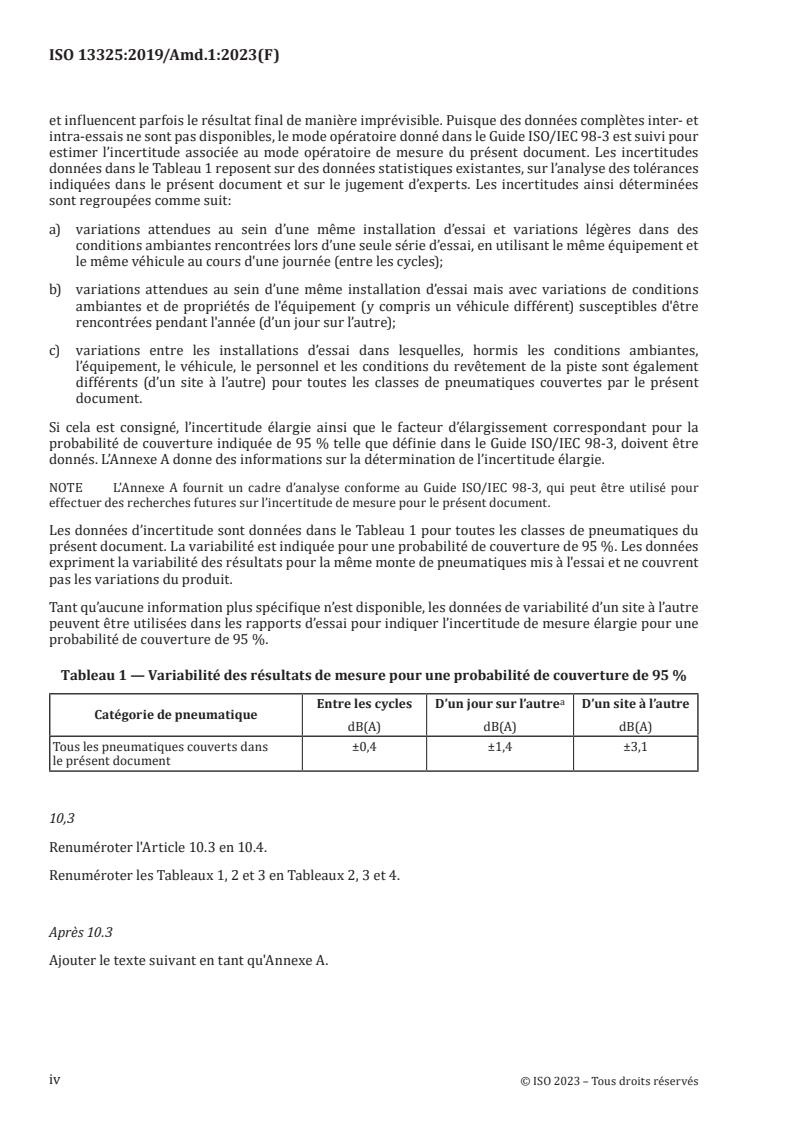 ISO 13325:2019/Amd 1:2023 - Pneumatiques — Méthodes en roue libre pour le mesurage de l'émission acoustique issue du contact pneumatique/chaussée — Amendement 1: Incertitudes Released:3. 04. 2023