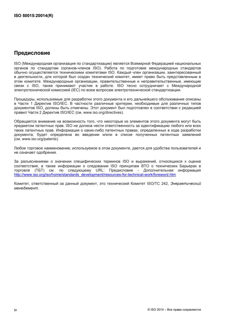 ISO 50015:2014 is a standard published by the International Organization for Standardization (ISO). Its full title is "Energy management systems - Measurement and verification of energy performance of organizations - General principles and guidance". This standard covers: ISO 50015:2014 establishes general principles and guidelines for the process of measurement and verification (M&V) of energy performance of an organization or its components. ISO 50015:2014 can be used independently, or in conjunction with other standards or protocols, and can be applied to all types of energy.