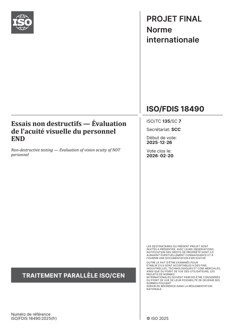 ISO/FDIS 18490 - Essais non destructifs — Évaluation de l'acuité visuelle du personnel END Released:14. 01. 2026