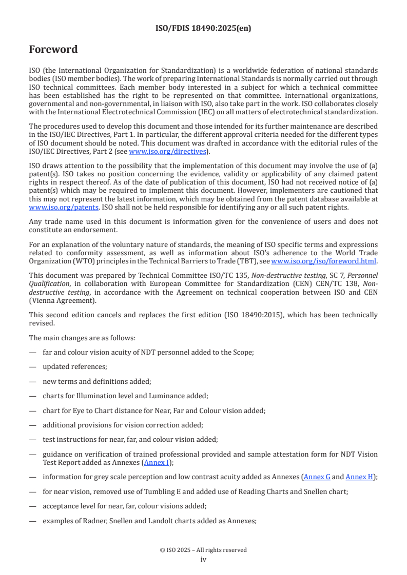 ISO/FDIS 18490:2025 is an international standard developed by ISO Technical Committee 135 (Non-destructive Testing) that specifies requirements for evaluating the vision acuity of Non-Destructive Testing (NDT) personnel. This standard outlines the criteria for near, far, and color vision acuity assessments under conditions similar to routine NDT inspections. It standardizes the test charts, procedures, acceptance levels, and qualifications of personnel authorized to administer these vision tests. Its primary purpose is to ensure NDT inspectors possess adequate visual capabilities for precise defect detection during inspections, supporting compliance with ISO 9712 for personnel certification.