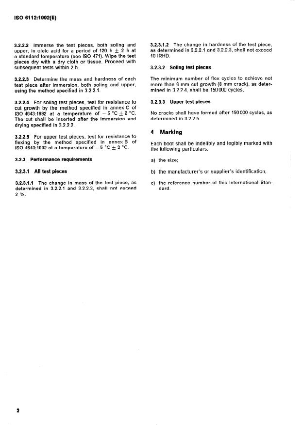 ISO 6112:1992 is a standard published by the International Organization for Standardization (ISO). Its full title is "Moulded plastics footwear — Lined or unlined poly(vinyl chloride) industrial boots with general-purpose resistance to animal fats and vegetable oils — Specification". This standard covers: Specifies requirements including the preparation of test pieces, the test procedure, the performance requirements and the marking.