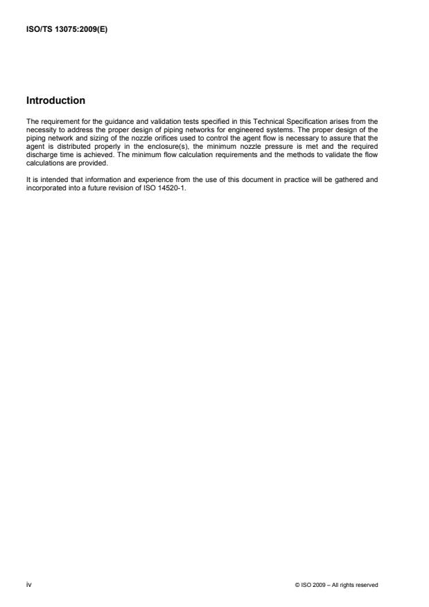 ISO/TS 13075:2009 is a technical specification published by the International Organization for Standardization (ISO). Its full title is "Gaseous-media fire-extinguishing systems — Engineered extinguishing systems — Flow calculation implementation method and flow verification and testing for approval". This standard covers: ISO/TS 13075:2009 provides recommendations for developing a flow calculation method for predicting critical flow parameters and an acceptable degree of accuracy for the proper design of piping networks for engineered systems.