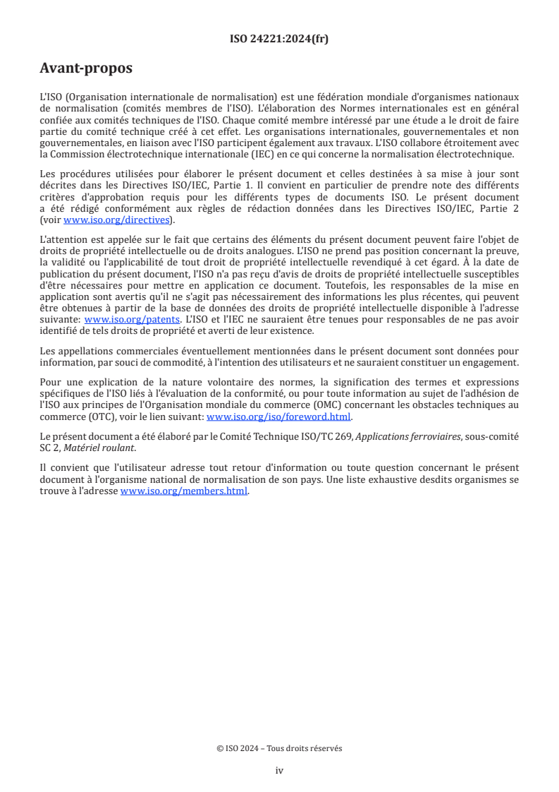 ISO 24221:2024 is a standard published by the International Organization for Standardization (ISO). Its full title is "Railway applications - Braking system - General requirements". This standard covers: This document specifies the general requirements for brake systems. This document focuses on general principles and general requirements of brake systems. This document is applicable for all types of rolling stock during design and whole lifetime. This document does not specify the braking performance criteria. This document can be applied to all rolling stock with metal to metal wheel/rail contact irrespective of speed classification.