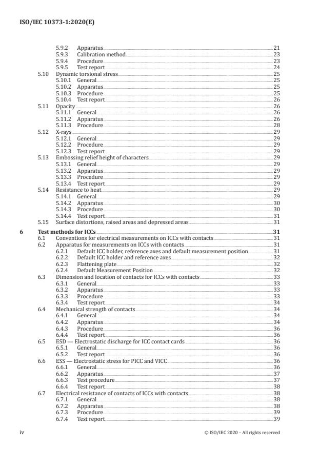 - ICC (integrated circuit card) specific tests: conventions for electrical measurements on contact cards, contact dimensions and location, mechanical strength of contacts, ESD considerations, holders and default measurement positions.