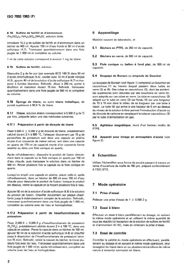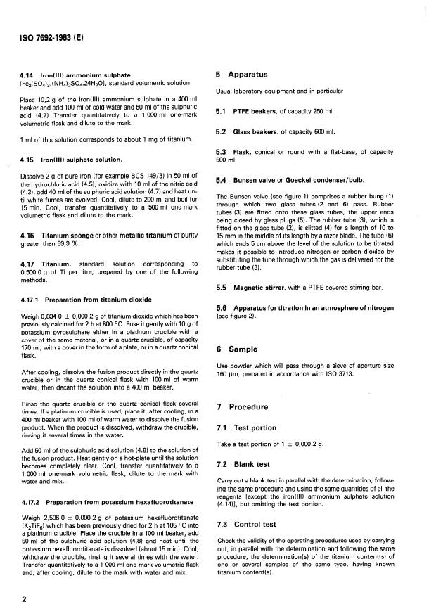 ISO 7692:1983 is a standard published by the International Organization for Standardization (ISO). Its full title is "Ferrotitanium - Determination of titanium content - Titrimetric method". This standard covers: The method is applicable to ferrotitanium having titanium contents between 20 and 80 % (m/m). Specifies principle, reagents, apparatus, sample, procedure, expression of results and test report. Figures show the Bunsen valve and the apparatus for titration.