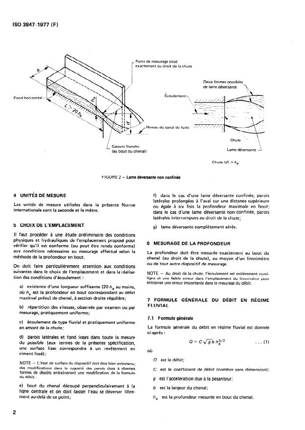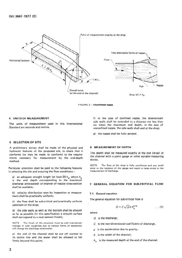 ISO 3847:1977 is a standard published by the International Organization for Standardization (ISO). Its full title is "Liquid flow measurement in open channels by weirs and flumes — End-depth method for estimation of flow in rectangular channels with a free overfall". This standard covers: Specifies a method for the estimation of sub-critical flow of clear water in smooth, straight, rectangular prismatic open channels with a vertical drop and discharging freely. Using the measured depth at the end, the flow in rectangular channels (horizontal or sloping) with confined nappe and unconfined nappe may be estimated.