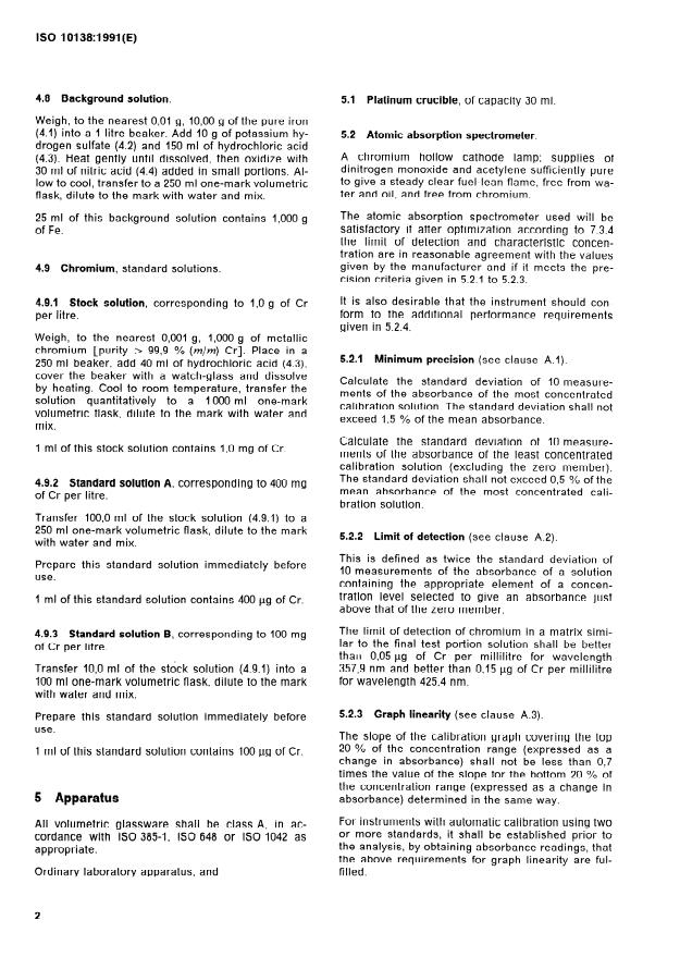 ISO 10138:1991 is a standard published by the International Organization for Standardization (ISO). Its full title is "Steel and iron — Determination of chromium content — Flame atomic absorption spectrometric method". This standard covers: The publication of ISO 10138 gives rise to the cancellation of ISO 4936:1984. The method described determines chromium in non-alloy and low-alloy steels and iron. It is applicable to chromium contents between 0,002 % (m/m) and 2,0 % (m/m). Specifies normative references, principle, reagents, apparatus, sampling, procedure, expression of results and test report. Procedures for the determination of instrumental criteria are given in annex A. Additional information on the international co-operative tests are given in annex B, annex C represents the precision data graphically.