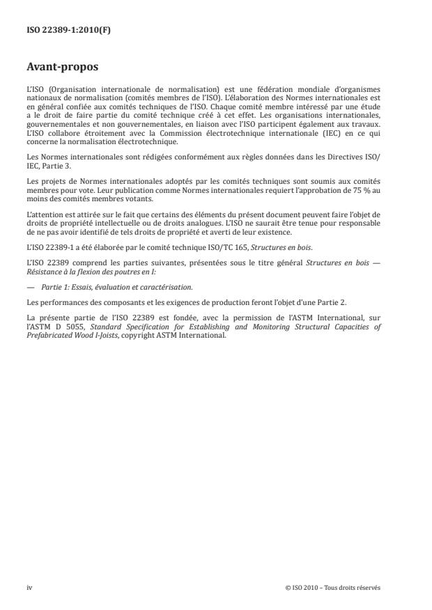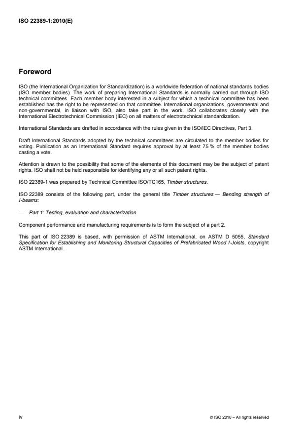 ISO 22389-1:2010 is a standard published by the International Organization for Standardization (ISO). Its full title is "Timber structures - Bending strength of I-beams - Part 1: Testing, evaluation and characterization". This standard covers: ISO 22389-1:2010 specifies the requirements for prefabricated wood-based I-beams used as structural members in bending applications. It gives procedures for establishing and evaluating structural capacities of prefabricated wood-based I-beams. The capacities considered are shear, moment, stiffness, bearing, and flange tension and compression. Procedures for establishing common details are given and certain end-use considerations specific to wood-based I-beams are itemized.