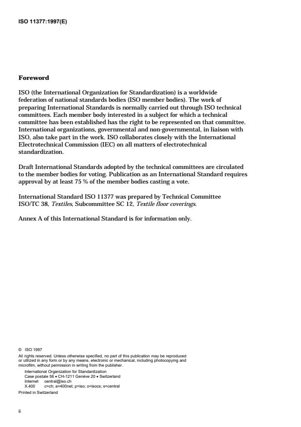 ISO 11377:1997 is a standard published by the International Organization for Standardization (ISO). Its full title is "Textile floor coverings - Floor soiling - Test site set-up and soiling evaluation". This standard covers: Textile floor coverings - Floor soiling - Test site set-up and soiling evaluation