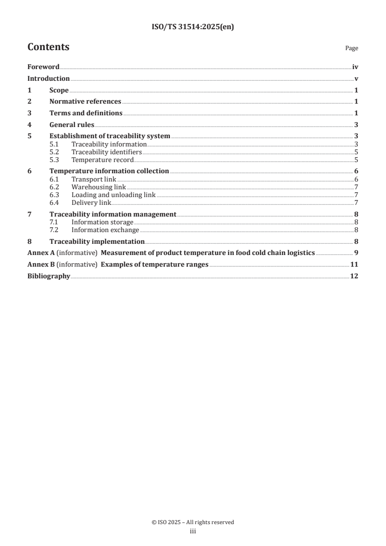 ISO/TS 31514:2025 is a technical specification published by the International Organization for Standardization (ISO). Its full title is "Requirements and recommendations for food traceability in cold chain logistics". This standard covers: This document specifies the requirements and recommendations for establishing a traceability system for food in cold chain logistics, which enables integrated functions such as collecting traceability information, managing traceability information and implementing traceability. This document is applicable to the management processes by supporting food traceability whereas cold chain logistics service providers are needed, covering transportation, warehousing, loading and unloading and other related points in cold chain logistics links towards the end customers.