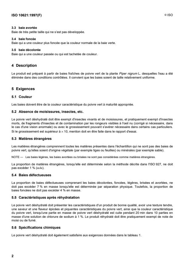 Keywords: ISO 10621, dehydrated green pepper specification, Piper nigrum, spice quality standards, food safety, spice packaging, chemical properties, moisture content, sulfur dioxide limits, spice import-export standards, rehydration properties, spice testing methods.