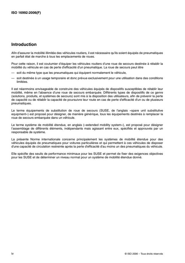 L'ISO 16992:2006 décrit les équipements de substitution de roue de secours (SUSE, de l'anglais «spare unit substitutive equipment») visant les pneumatiques pour voitures particulières, ces équipements étant destinés à permettre à l'utilisateur de poursuivre sa route (avec ou sans arrêt) avec une marge de sécurité raisonnable. Elle ne vise que la qualification des performances des systèmes de mobilité étendue. Elle reprend uniquement des spécifications pour les systèmes de mobilité étendue qui permettent d'assurer la mobilité étendue d'un véhicule. Elle couvre la période à partir du moment où le système de mobilité étendue intervient et où le chauffeur garde la maîtrise (vitesse et direction) du véhicule pour tenter d'atteindre un lieu adéquat pour effectuer le travail qu'impose l'avarie. Elle ne couvre pas le véhicule équipé d'un tel système, le pneumatique gonflé, les propriétés du dispositif de surveillance de pression et de fonction d'alerte par rapport à l'état gonflé ou partiellement dégonflé suite à des pertes de pression lentes, le cas échéant la période transitoire avant l'intervention du dispositif, et l'examen, l'évaluation et l'entretien du système de mobilité étendue après que le système soit intervenu en mode de roulage à plat. Elle comprend une description des différents types de SUSE, et une description et des niveaux de performance des systèmes de mobilité étendue complets.