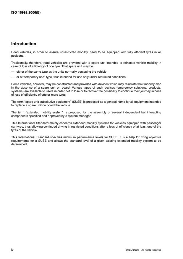 ISO 16992:2006 describes spare unit substitutive equipment (SUSE) for passenger car tyres. This equipment is designed to allow the user to continue on the journey (with or without a stop) in a reasonably safe manner. ISO 16992:2006 only aims to qualify the performance of extended mobility systems. It details specifications only for extended mobility systems suitable to permit the extended mobility of the vehicle. Other types of SUSE are described in the informative annexes. ISO 16992:2006 applies from the moment the extended mobility system becomes effective, and the driver has continued control of the vehicle (in speed and direction) in order to attempt to reach an appropriate place for servicing. ISO 16992:2006 does not cover the vehicle thus equipped; the tyre while operating in inflated mode; the characteristics of the pressure survey device and of the warning function relative to the inflated mode or to the partially deflated mode due to slow pressure losses; the transitory phase, if any, before the equipment becomes effective; the inspection, assessment, and the servicing of the extended mobility system after it has been activated in flat tyre running mode. ISO 16992:2006 includes the description of the various types of SUSE; the description and performance levels of complete extended mobility systems.