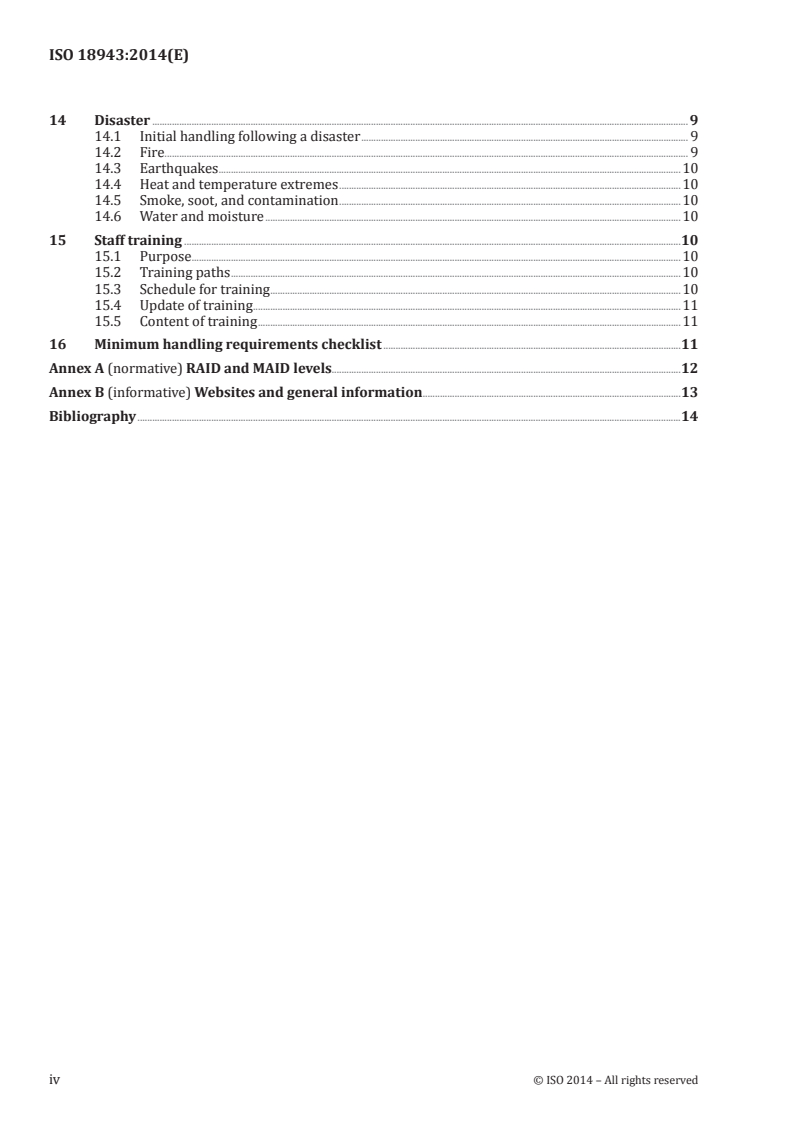 ISO 18943:2014 concerns the storage, care, and handling of HDDs. It recommends handling procedures to maximise the effective life of the data written on magnetic HDDs. Faulty care and handling methods can cause damage to a disk and the contents written thereon. It also recommends storage practices to preserve both the hard disk media and the content encoded thereon. The recommendations in this International Standard apply where the desired result is extended-term retention of the data encoded on the disk. The use of the phrase "care and handling" in this International Standard is restricted to the physical domain or hardware aspects of the HDD. This International Standard is not intended to address associated or relative system aspects of HDDs. With recognition that the scope of systems is covered in other standards, this International Standard precisely aims to fill a void of information on HDDs as physical media with failure mechanisms and handling risks. This International Standard does not promote or advocate that proper physical care and handling represents the only element on the path to extended-term usage (more than two years), but rather is part of a comprehensive set of practices to mitigate risks in the long term preservation of content stored on HDDs.