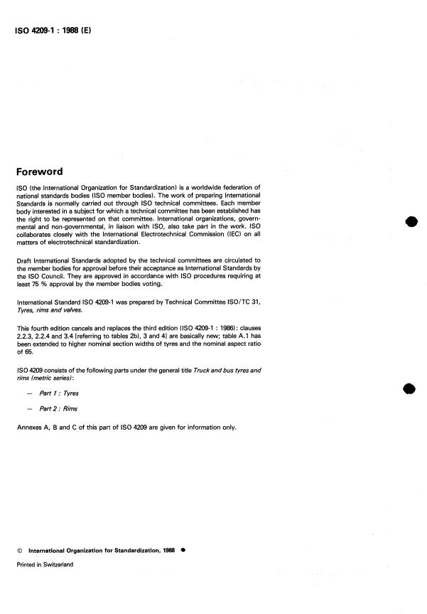 ISO 4209-1:1988 is a standard published by the International Organization for Standardization (ISO). Its full title is "Truck and bus tyres and rims (metric series) — Part 1: Tyres". This standard covers: Truck and bus tyres and rims (metric series) — Part 1: Tyres