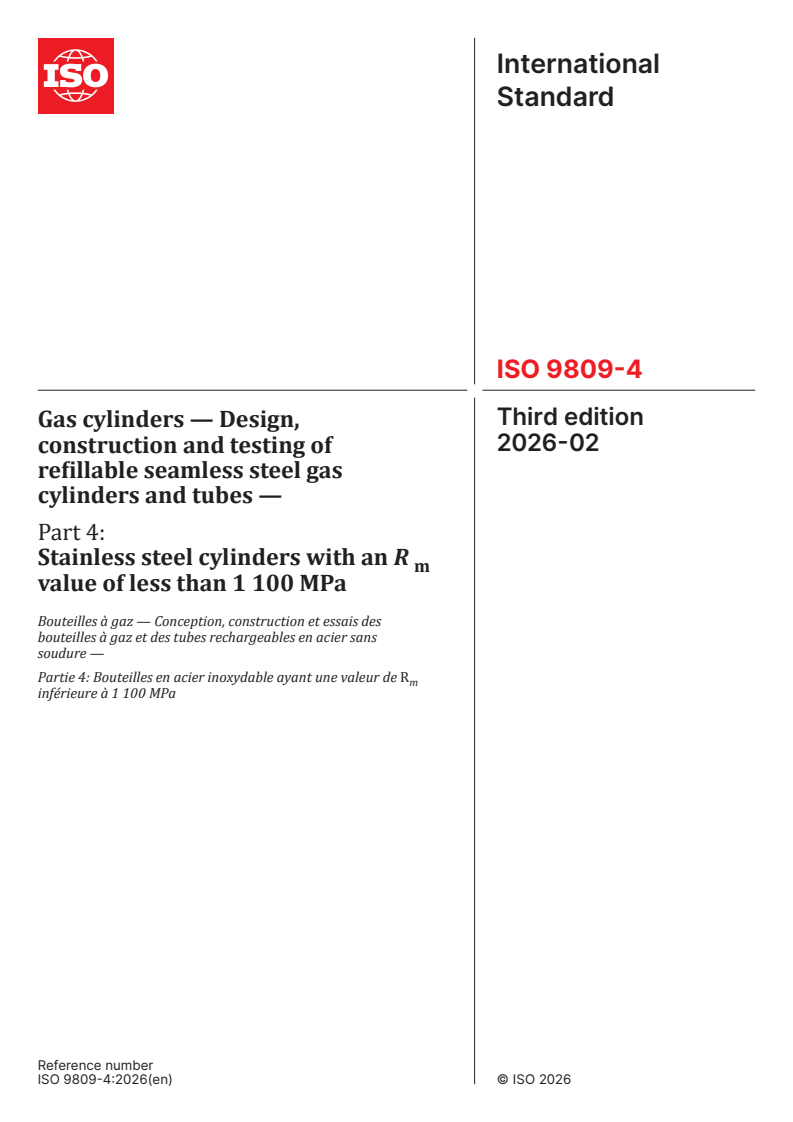 ISO 9809-4:2026 - Gas cylinders — Design, construction and testing of refillable seamless steel gas cylinders and tubes — Part 4: Stainless steel cylinders with an R m value of less than 1 100 MPa