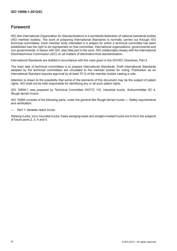 ISO 10896-1:2012 is a standard published by the International Organization for Standardization (ISO). Its full title is "Rough-terrain trucks — Safety requirements and verification — Part 1: Variable-reach trucks". This standard covers: Rough-terrain trucks — Safety requirements and verification — Part 1: Variable-reach trucks