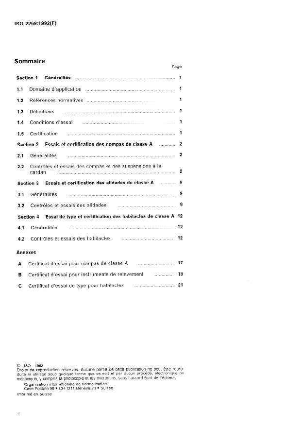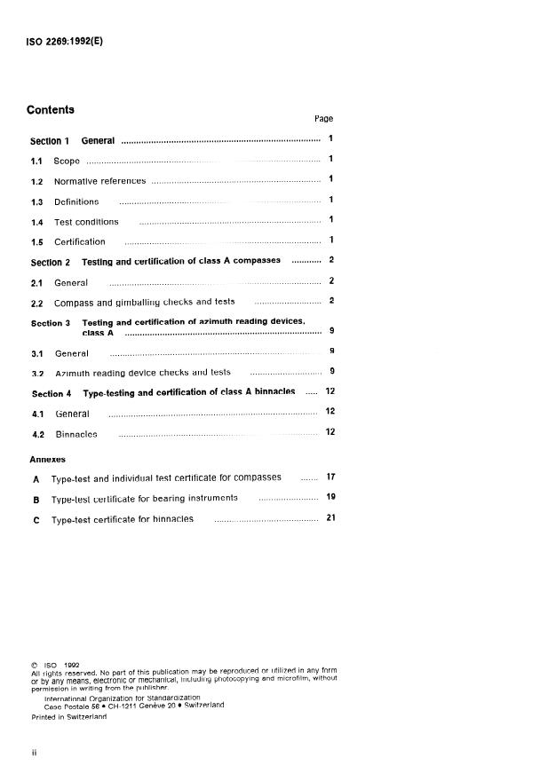 ISO 2269:1992 is a standard published by the International Organization for Standardization (ISO). Its full title is "Shipbuilding — Class A magnetic compasses, azimuth reading devices and binnacles — Tests and certification". This standard covers: Specifies type-test and individual test methods, and gives the acceptable limits of the characteristics necessary to guarantee conformity to the general specifications given in ISO 449. Annexes A, B and C include type-test and individual test certificates.