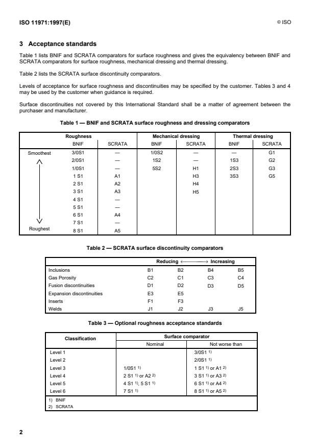 Table 1 lists BNIF and SCRATA comparators for surface roughness and gives the equivalency between BNIF an