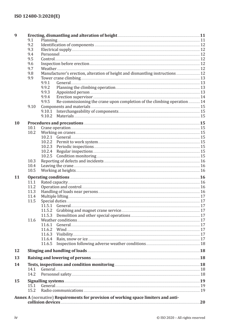 ISO 12480-3:2020 - "Cranes - Safe use - Part 3: Tower cranes" defines required practices for the safe use of tower cranes. The standard covers management and planning of lifting operations, selection and responsibilities of personnel, erection and dismantling (including climbing and alterations of height), foundations and special bases, operation, maintenance, inspection and condition monitoring. It explicitly excludes manually (non-powered) operated cranes or cranes with any manually operated motion.