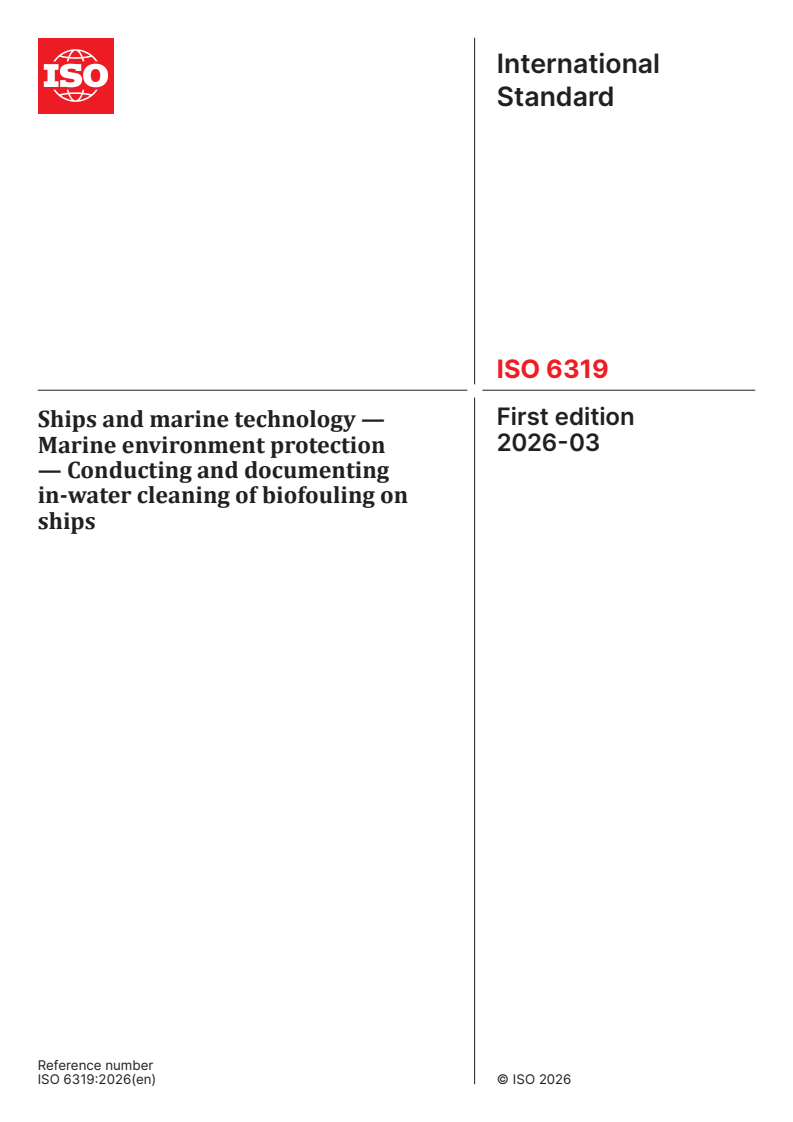 ISO/PRF 6319:2026, titled Ships and Marine Technology - Marine Environment Protection - Conducting and Documenting In-Water Cleaning of Biofouling on Ships, is an international standard developed by ISO to establish best practices for managing in-water cleaning (IWC) operations. This standard focuses on enabling safe, efficient, and environmentally sound removal of biofouling from the external submerged surfaces of ships, including hulls and niche areas. It addresses all types and levels of biofouling-biofilms, microfouling, and macrofouling-and covers cleaning methods performed both with and without capture of removed material. The standard excludes internal piping systems.