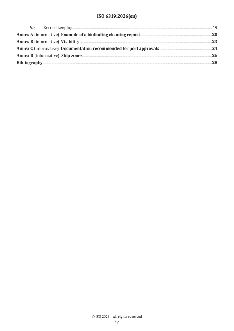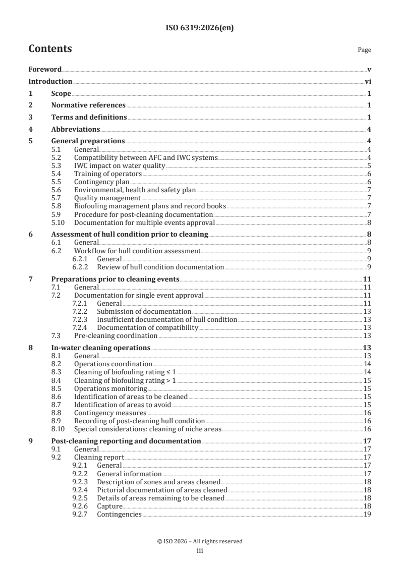 ISO 6319:2026 is a standard published by the International Organization for Standardization (ISO). Its full title is "Ships and marine technology — Marine environment protection — Conducting and documenting in-water cleaning of biofouling on ships". This standard covers: This document provides requirements and best practices for planning, conducting and documenting in-water cleaning (IWC) operations safely, efficiently and in an environmentally sound manner. Additionally, this document provides requirements and best practices for reporting on the effectiveness of IWC operations. This document addresses all forms of IWC of external submerged surfaces, which are hull and niche areas, all types and levels of biofouling, which means biofilms, microfouling and macrofouling, conducted both with or without capture. It does not address internal piping. The document has been established to inform ports, regulatory agencies, ship biofouling IWC service providers, inspection service providers, IWC equipment manufacturers, coating manufacturers, shipowners, ship managers, ship operators and other relevant stakeholders.