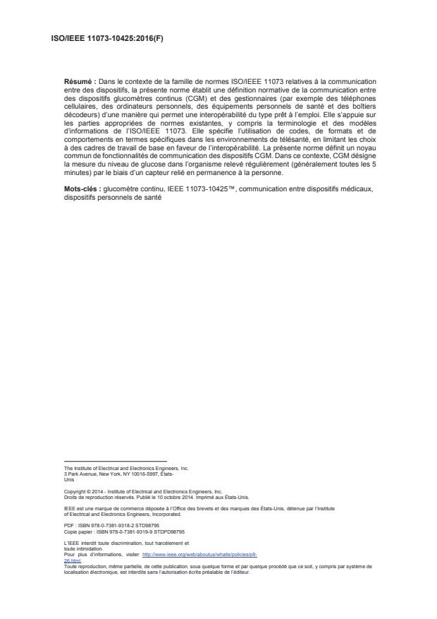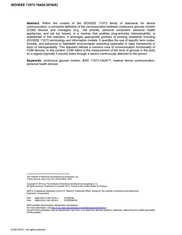 ISO/IEEE 11073-10425:2016 is a standard published by the International Organization for Standardization (ISO). Its full title is "Health informatics — Personal health device communication — Part 10425: Device specialization — Continuous glucose monitor (CGM)". This standard covers: Health informatics — Personal health device communication — Part 10425: Device specialization — Continuous glucose monitor (CGM)