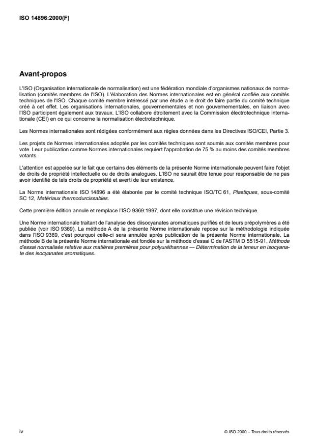 ISO 14896:2000 is a standard published by the International Organization for Standardization (ISO). Its full title is "Plastics — Polyurethane raw materials — Determination of isocyanate content". This standard covers: La présente Norme internationale prescrit deux méthodes pour la détermination de la teneur en isocyanate des iso-cyanates aromatiques utilisés comme matières premières pour polyuréthannes. La méthode A est principalement applicable au toluylène-diisocyanate (TDI), au méthylène-bis-(4-phénylisocyanate) (MDI) purifiés et à leurs prépolymères. La méthode B est applicable aux isocyanates purifiés, bruts ou modifiés dérivés du toluylène-diisocyanate, du méthylène-bis-(4-phénylisocyanate) et du polyméthylène polyphénylisocyanate. Cette méthode peut également être utilisée avec les mélanges d'isomères de toluylène-diisocyanate, de méthylène- bis-(4-phé nyl isocyan ate) et de polyméthylène polyphénylisocyanate. D'autres isocyanates aromatiques peuvent être analysés selon cette méthode si l'on prend soin de vérifier son adéquation. La présente méthode n'est pas applicable aux isocyanates séquencés.