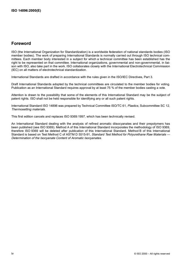 ISO 14896:2000 - Plastics -- Polyurethane raw materials -- Determination of isocyanate content