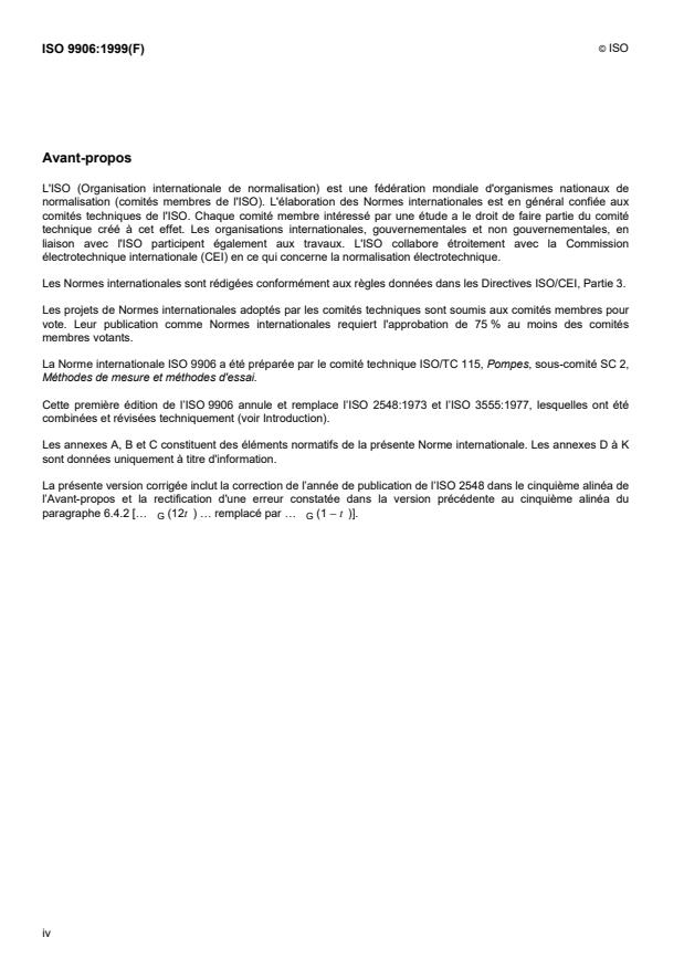 ISO 9906:1999 is a standard published by the International Organization for Standardization (ISO). Its full title is "Rotodynamic pumps — Hydraulic performance acceptance tests — Grades 1 and 2". This standard covers: La présente Norme internationale spécifie des essais de fonctionnement hydraulique pour la réception des pompes rotodynamiques (pompes centrifuges, hélico-centrifuges et hélices simplement désignées «pompes» dans la suite). Elle peut s'appliquer aux pompes de toutes tailles et à tous les liquides pompés se comportant comme l'eau propre et froide telle que définie en 5.4.5.2. Elle ne concerne pas les détails de structure de la pompe ni les propriétés mécaniques de ses composants.La présente Norme internationale contient deux niveaux de précision de mesurage: le niveau 1 pour la précision la plus élevée et le niveau 2 pour la précision la plus faible. Ces niveaux incluent différentes valeurs pour les facteurs de tolérance, les fluctuations admissibles et les incertitudes de mesurage.Pour les pompes produites en série selon le choix fait à partir des courbes de performances typiques et pour les pompes de puissance inférieure à 10 kW, voir l'annexe D pour des facteurs de tolérance supérieure.La présente Norme internationale est applicable soit à la pompe elle-même sans accessoire, soit à une combinaison d'une pompe associée à tout ou partie de ses accessoires à l'aval et/ou à l'amont.