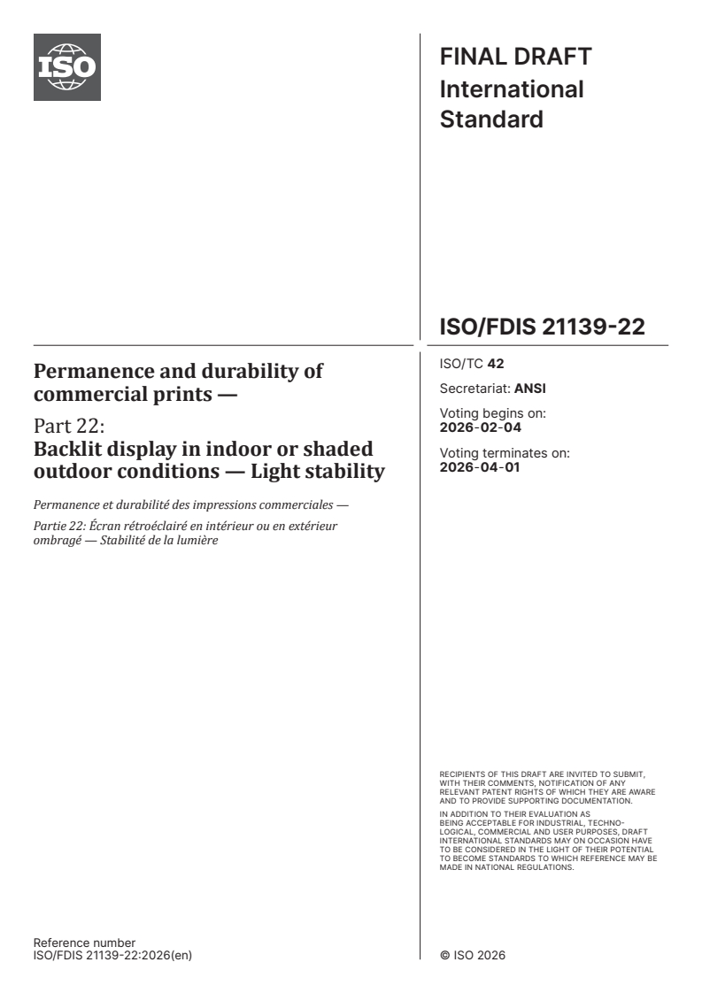 ISO/FDIS 21139-22 - Permanence and durability of commercial prints — Part 22: Backlit display in indoor or shaded outdoor conditions — Light stability Released:21. 01. 2026