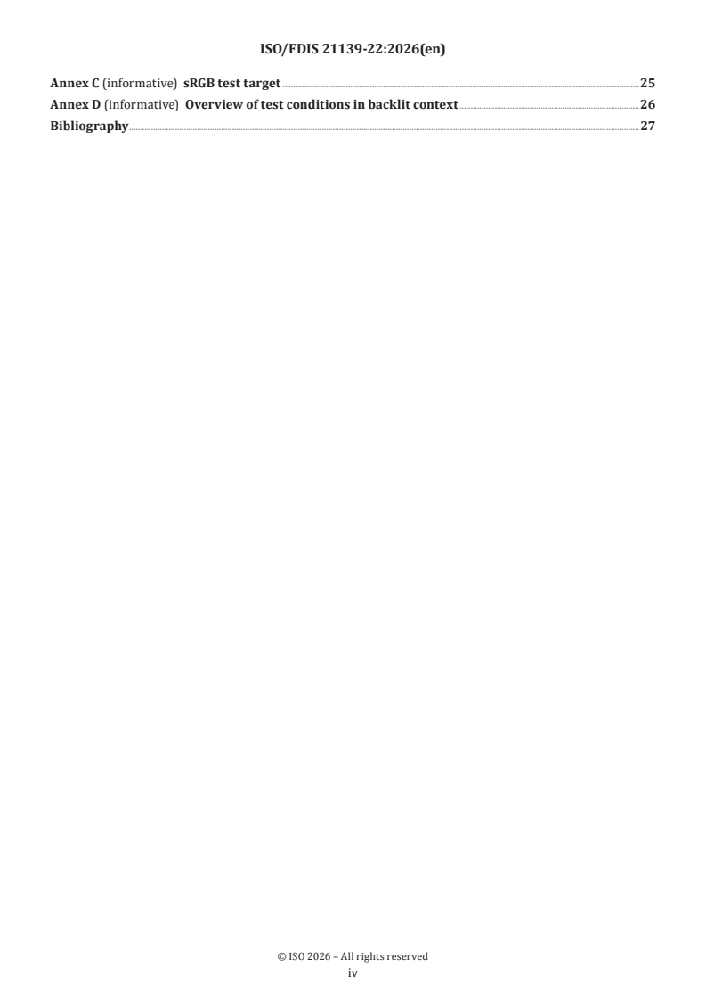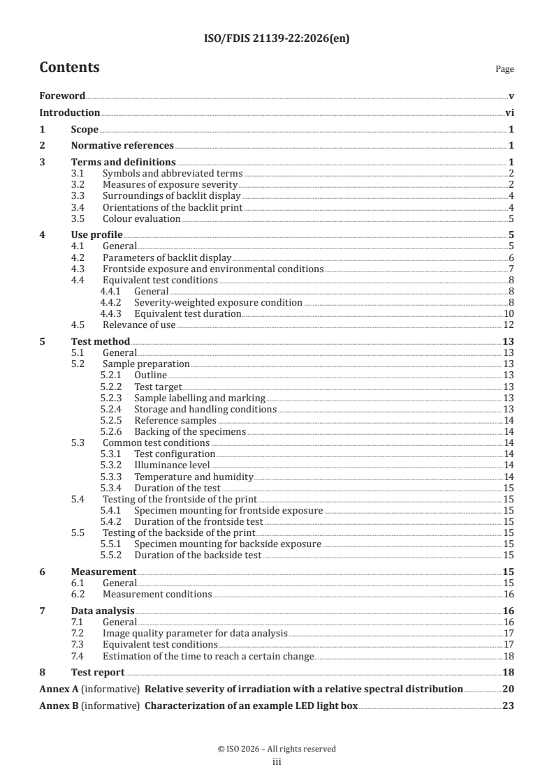 ISO/FDIS 21139-22:2026 defines standardized test methods for evaluating the light stability and durability of commercial prints designed for backlit display in indoor or shaded outdoor conditions. Developed by the International Organization for Standardization (ISO), this standard applies to prints on transparent or translucent substrates, such as foils, films, sheets, paper, and textiles, which are displayed in environments protected from direct precipitation and radiative heating. The document covers both analogue and digital print technologies, ensuring consistent evaluation criteria for image permanence across a variety of commercial applications.