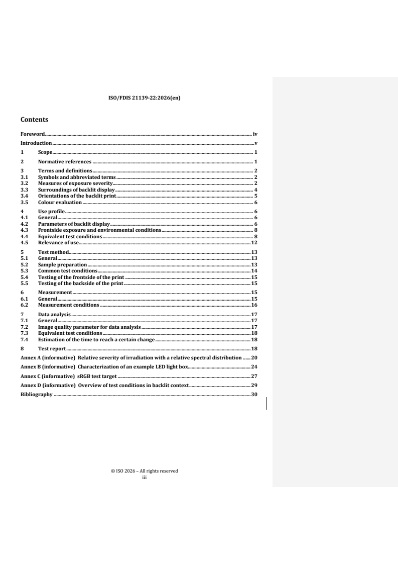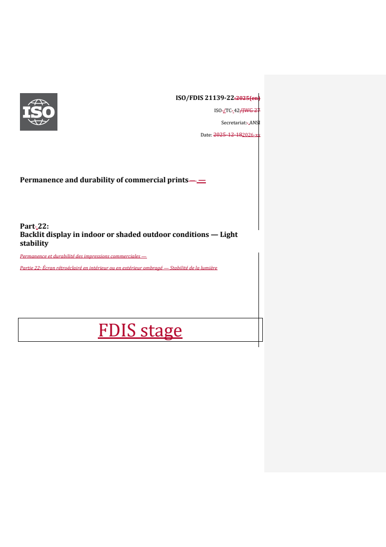 REDLINE ISO/FDIS 21139-22 - Permanence and durability of commercial prints — Part 22: Backlit display in indoor or shaded outdoor conditions — Light stability Released:21. 01. 2026
