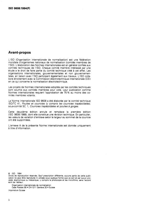ISO 9608:1994 is a standard published by the International Organization for Standardization (ISO). Its full title is "V-belts — Uniformity of belts — Test method for determination of centre distance variation". This standard covers: Cancels and replaces the first edition (1988). Specifies a test method for determining the centre distance variation of V-belt drives as a criterion for the uniformity of V-belts.